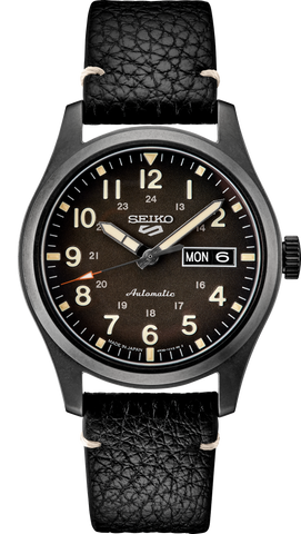 Seiko 5 Sports Collection Inspired by vintage field/military style Automatic with manual winding capability Black dial Day/date calendar Luminous hands and markers Red-orange tipped second hand Screwdown see-through caseback