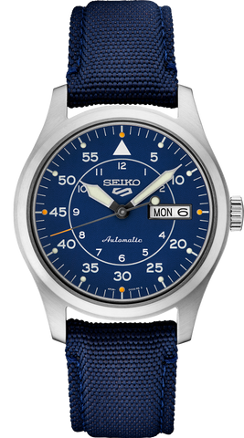 Seiko 5 Sports Collection Inspired by vintage designs worn by early pilots Automatic with manual winding capability Blue dial 60-minute track marked in five-minute increments Day/date calendar Luminous hands and markers Orange-tipped second hand Screwdown see-through caseback