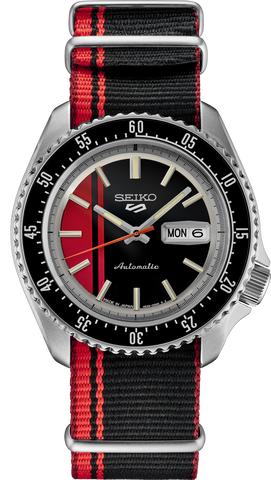 Seiko 5 Sports U.S Special Creation. With vivid colors and bold design inspired by the stripes of vintage race cars, this dynamic watch delivers both memorable styling and durability. For added impact, the black and red stripes flow from the dial to the coordinated nylon strap, sized to fit easily over a racing uniform. Framed by a black uni-directional rotating bezel, the dial also offers a day/date calendar, red second hand, and luminous hands and markers. Providing automatic technology that you control with every movement, this memorable timepiece is powered by a 24-jewel movement that beats at a frequency of 21,600 vibrations per hour, with a power reserve of approximately 41 hours and manual winding capability. The case, in stainless steel, includes a screwdown see-through caseback for a view of classic timekeeping in action. 10 bar, 100M Water Resistant
