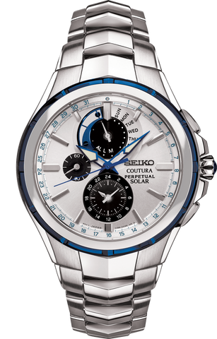 From the Coutura Collection Solar perpetual calendar alarm chronograph Perpetual calendar adjusts for odd and even months, including leap years, until 2100. Chronograph measures up to 60 minutes of elapsed time in 1/5-second increments with split time measurement function Alarm function Silver sunray dial with blue subdials and accents Power reserve indicator Leap year, month, day and date indicator 24-hour subdial LumiBrite hands and markers Bezel with blue ion finish Screwdown caseback Cabochon crown