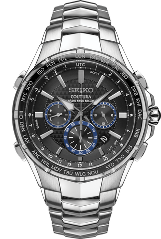 Seiko Coutura Radio Sync Solar Chronograph. This bold men’s watch is designed with a stainless steel case and bracelet and a cabochon crown. The bold black dial features lumiBrite hands and markers, a date calendar and three subdials with blue highlights. The gray bezel includes a world time function featuring 25 time zones. Radio-controlled, Radio Sync Solar Chronograph automatically receives radio signals to precisely adjust the time and calendar signal reception and result indicator. The chronograph measures up to 60 minutes in 1/5 second increments with a split time measurement function and a date calendar. Powered by any light energy, its Solar Cell is energy-efficient with a 6-month power reserve once fully charged. No battery change is required. 100M Water Resistant
