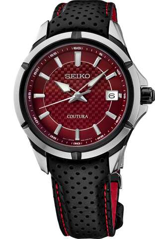 From the Coutura Collection. Delivering the perfect blend of edge and elegance for those on the move, the Coutura Collection combines bold angularity and shading with superior timekeeping for effortless sport/dress style. Inspired by motor sports, with a case design incorporating the angles and edges of racecar architecture, this dashingly sculpted timepiece features a multi-layer carbon-fiber patterned red dial styled with applied indices for a rich dimensionality and includes a date calendar, white second hand, and LumiBrite hands and markers. Crafted of stainless steel with black accents and a black perforated leather strap with red stitching, designed to echo driving gloves, this dynamic watch is equipped with a scratch-resistant sapphire crystal, screwdown caseback, tri-fold push button release clasp and a cabochon crown for a truly tailored look. 10 bar, 100M Water Resistant