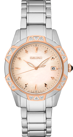 From the Diamond Collection. Designed for everyday elegance, this distinctive watch features 14 diamonds bezel-set in six directions to suggest the spread of sunlight. An updated slightly larger case, paired with the classic touches of a mother-of-pearl dial and cabochon crown, provides smooth day to night style. Crafted of stainless steel, in a versatile rose gold two-tone finish, this graceful watch includes uniquely shaped markers, a date calendar, scratch-resistant sapphire crystal and tri-fold push button release clasp. 10 bar, 100M Water Resistant