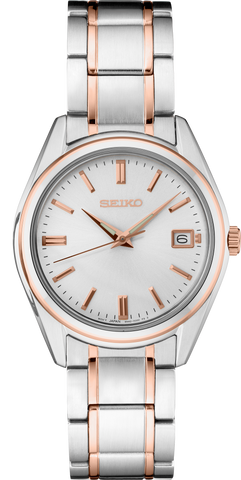 From the Essentials Collection. With classic dress/sport styling, this perfectly tailored design combines sophisticated minimalism with versatility. The sunray-finish silver dial features a date calendar and LumiBrite hands. In stainless steel, with rose-gold two-tone finish, and sapphire crystal for superior scratch resistance. 10 bar, 100M Water Resistant