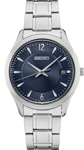 From the Essentials Collection. Offering classic dress/sport designs, the Essentials Collection provides the ideal solution for everyday wear. Crafted of stainless steel, this perfectly tailored watch features a patterned blue dial with date calendar, as well as Arabic numerals and stick markers, for a superb blend of clarity and style. The sapphire crystal adds superior scratch resistance. 10 bar, 100M Water Resistant