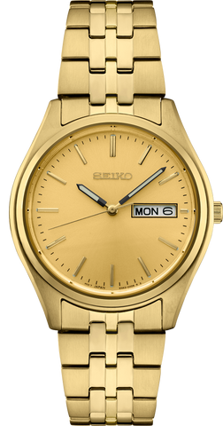 From the Essentials Collection. Offering classic dress/sport designs, the Essentials Collection provides the ideal solution for everyday wear. Crafted of stainless steel in gold-tone finish, this perfectly balanced watch features a champagne sunray dial with day/date calendar and sleek gold stick markers for a superb blend of clarity and style. 10 bar, 100M Water Resistant