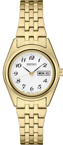 From the Essentials Collection. Offering classic dress/sport designs, the Essentials Collection provides the ideal solution for everyday wear. Crafted of stainless steel in gold-tone finish, this perfectly balanced watch features a white dial with Arabic numerals and day/date calendar for a superb blend of clarity and style. 10 bar, 100M Water Resistant