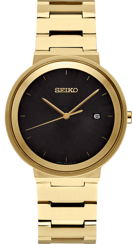 From the Essentials Collection Contemporary minimalist design Black sunray dial with gold accents Date calendar