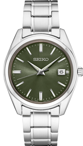 From the Essentials Collection. An updated classic, this sleek and versatile watch offers a clean, modern sunray dial, with simple stick indices and date calendar, in a new olive-toned green inspired by the deep color of the forest. Crafted of stainless steel with scratch-resistant sapphire crystal, secure screwdown caseback and tri-fold push button release clasp. 10 bar, 100M Water Resistant