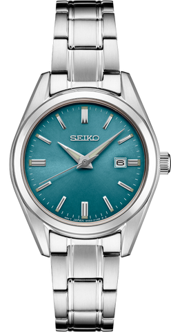 From the Essentials Collection Blue sunray dial in a new color inspired by the richness of water Silver stick indices Date calendar Screwdown caseback Tri-fold push button release clasp