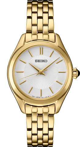 From the Essentials Collection. With elegant, jewelry-inspired styling, this gracefully updated watch features a sophisticated white dial with gold accents and a subtle center radial pattern. The gold hands and slim stick indices suggest individual beams of light. Including a classic cabochon crown, this beautifully balanced design is crafted of stainless steel in gold finish, and offers a tri-fold push button release clasp. 5 bar, 50M Water Resistant
