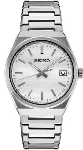 From the Essentials Collection Case and bracelet designed with sleekly angled contemporary profile Silver pressed-pattern dial Silver stick indices Date calendar LumiBrite hands and markers Screwdown caseback Tri-fold push button release clasp