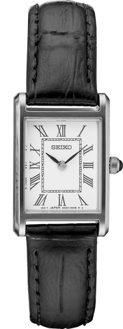 From the Essentials Collection. Offering classic designs, the Essentials Collection provides the ideal solution for everyday wear. Crafted of stainless steel, this elegant watch, with sophisticated rectangular case, features a traditional white dial with Roman numerals and finely shaped hands, cabochon crown and black leather strap for perfect day-to-evening style. 3 bar, 30M Water Resistant