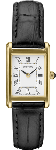 From the Essentials Collection. Offering classic designs, the Essentials Collection provides the ideal solution for everyday wear. Crafted of stainless steel in gold-tone finish, this elegant watch, with sophisticated rectangular case, features a traditional white dial with Roman numerals and finely shaped hands, cabochon crown and black leather strap for perfect day-to-evening style. 3 bar, 30M Water Resistant