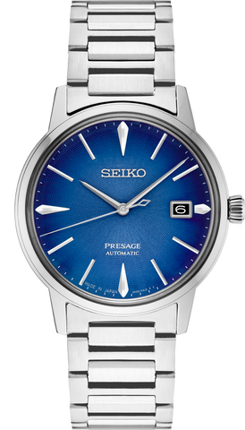 Seiko Presage Cocktail Time Inspired by the vibrant elegance of the exciting cocktail lounges in today's Tokyo Fine mechanical watchmaking from Japan Automatic with manual winding capability Gradated blue dial with pressed pattern and gloss finish inspired by the Aviation cocktail Date calendar Silver hands, markers and accents Screwdown see-through caseback Double deployment clasp with push button release