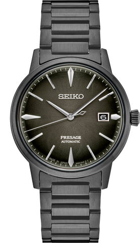 Seiko Presage Cocktail Time Inspired by the vibrant elegance of the exciting cocktail lounges in today's Tokyo Fine mechanical watchmaking from Japan Automatic with manual winding capability Gradated black dial with pressed pattern and gloss finish inspired by the Black Velvet cocktail Date calendar Silver hands, markers and accents Screwdown see-through caseback Double deployment clasp with push button release