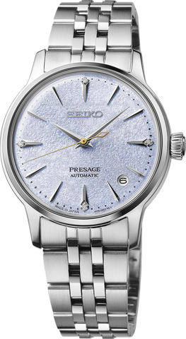 Seiko Presage Cocktail Time. Offering the finest in Japanese mechanical watchmaking, the Presage Collection blends precision technology with superior craftsmanship and design. Offering a graceful and fresh twist to the popular Cocktail Time series, this charming watch, inspired by the Frozen Skydiving cocktail, features a lovely light blue dial with a stunning pressed pattern evoking crunchy ice. Four diamonds, artfully incorporated into the signature wedge-shaped markers at 12,3,6, and 9 o’clock, add a luxurious sparkle. The streamlined case houses a 23-jewel automatic movement, which beats at a frequency of 21,600 vibrations per hour, with a power reserve of approximately 41 hours and manual winding capability. Crafted of stainless steel with a delicately tapered bracelet, this distinctive timepiece includes a date calendar, box-shaped crystal, screwdown caseback, and deployment clasp with push-button release. 5 bar, 50M Water Resistant