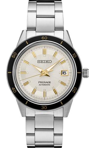 Presage Style'60s Collection Inspired by the styles of the 1960s, including the 1964 "Crown Chronograph, " Japan's first watch with a stopwatch function Fine mechanical watchmaking from Japan Automatic with manual winding capability Ivory dial Date calendar LumiBrite hands and markers Black bezel Screwdown see-through caseback Tri-fold push button release clasp