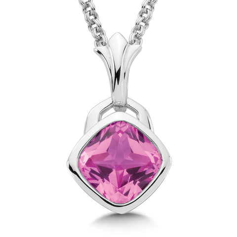 A gorgeous Sterling Silver 9 mm Faceted Created Pink Sapphire Fleur De Lis Pendant with chain included.