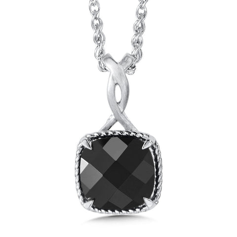 Onxy pendant accented with a twist of sterling silver. Cushion 9X9 mm center.