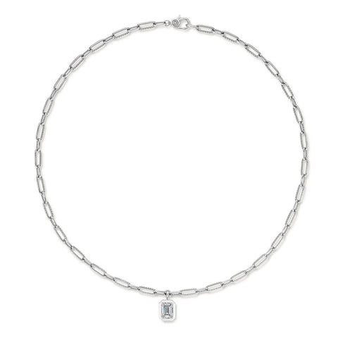 A bezel pendant of captivating depths. The high polish frame enthralls a lab grown diamond center. On the reverse, hand-hewn milgrain and pinpoint mined diamonds add dimension. On the chain, Crescent-embellished links alternate with petite links.