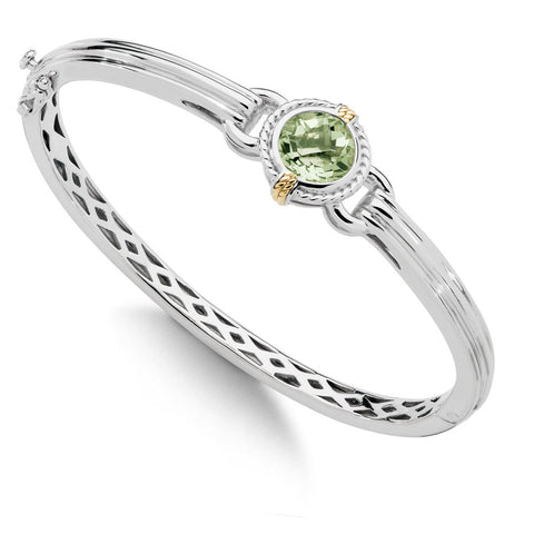 A fashionable 60x47 mm Sterling Silver and 18K Gold Bangle Bracelet with 10 mm Faceted Green Amethyst, a box clasp, and secure locking mechanism.