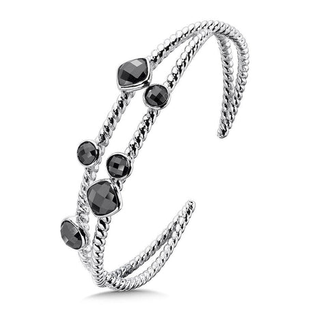 A Trendy Sterling Silver Hematite Cuff with a playful rope texture and open design with alternating round a cushion stone shapes.