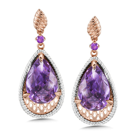 Amethyst earrings in 14k rose and white gold with 12X8 mm pear-shape centers.