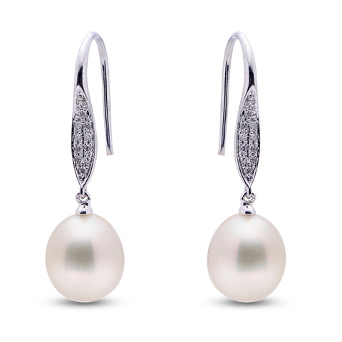These classic shepherds hook earrings are fashioned in solid 14k gold and feature 22 pave set round, white, sparkling diamonds. Two 9-9.5mm lustrous freshwater cultured pearls finish off the design for an overall timeless appeal.