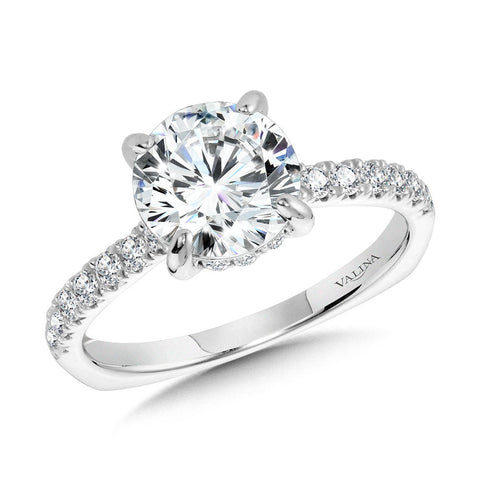 A hidden halo wraps around the round center stone’s pavilion, beneath the prongs. This trendy head design rests on a straight shank featuring larger-than-average accent diamonds.