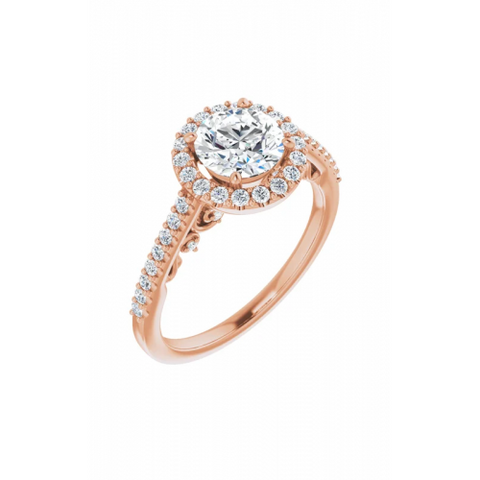 Show your partner how deep your love extends with this glamorous halo engagement ring from Stuller. This timeless engagement ring contains heirloom details with a modern design. Made from premium 14k rose gold, this engagement ring will retain its original luster for ages. With masterful metalwork in this ring's design, this band is a stunning representation of your lasting commitment. A protective setting guards your center stone from abrasions, helping to give any stone a distinct shimmer and shine. Azzi Jewelers in Ingham County are devoted to providing customers with a plethora of luxury jewelry from today’s major brands. Reach out to us above online or over the phone, or stop by to see this piece in person.