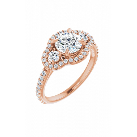 Give your lover the gift of brilliance and fire with this impeccable halo and three stone engagement ring from Stuller. This versatile engagement ring has old characteristics with a trendy design. Made from high-end 14k rose gold, this keepsake can withstand normal wear and tear for decades. With masterful metalwork in this ring's build, this engagement ring is a stunning representation of your commitment. A secure setting guards your center stone from damage, helping to give any stone shimmer and shine. Azzi Jewelers are dedicated to offering customers with a range of bridal jewelry from today’s major brands. Reach out to us above online or over the phone, or stop by to see this piece in person.