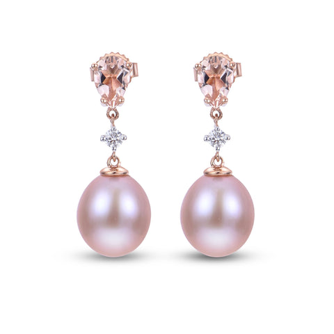 8-8.5mm natural color pink freshwater pearl drop earrings in 14k rose gold featuring diamonds and morganite.