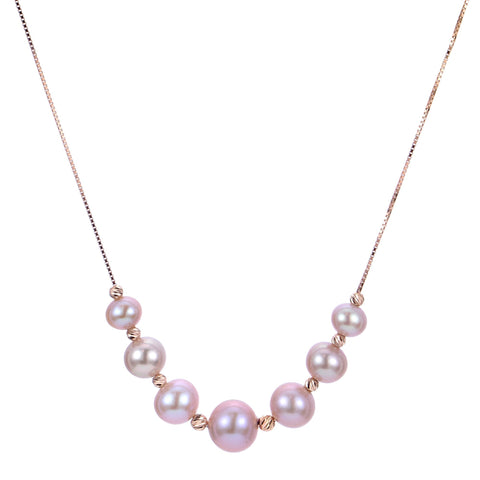 This necklace is made in 14k rose gold and features our signature diamond cut brilliance beads. We have selected 5-8mm natural colored pink freshwater pearls as the perfect color match to the rose gold.