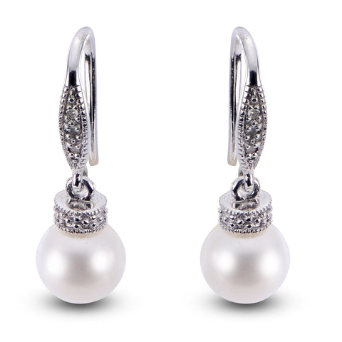 Sterling Silver7-7.5MM white freshwater cultured pearl and diamond earrings.