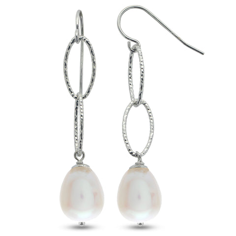 Sterling silver station earrings featuring two oval shaped high luster 9mm cultured pearls.