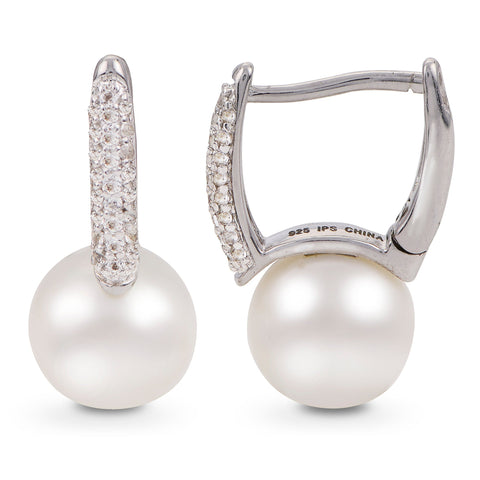 925 9-10MM FWC PEARL WHITE TOPAZ HOOP EARRING