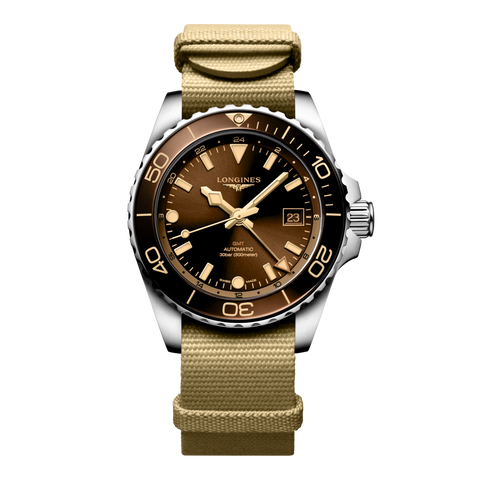 TECHNICAL DATAMODEL: L3.790.4.66.2 COLLECTION: Conquest SUB COLLECTION: Conquest DIAL COLOR: Brown STRAP COLOR: Beige STRAP MATERIAL: Nylon STRAP BUCKLE: With Buckle MOVEMENT: Automatic CALIBER: 844 CASE SHAPE: Round CASE SIZE: 41.00 mm CASE MATERIAL: Stainless steel and ceramic bezel BEZEL MATERIAL: Screw-in crown, Unidirectional rotating bezel WATER PROOF: 30 bar