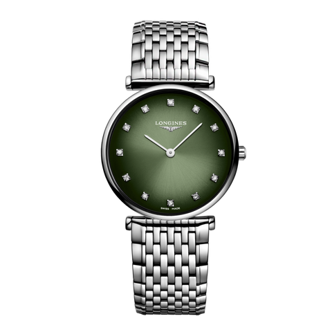 TECHNICAL DATAMODEL: L4.512.4.92.C COLLECTION: Elegance SUB COLLECTION: La Grande Classique DIAL COLOR: Green STRAP MATERIAL: Stainless Steel STRAP BUCKLE: With triple safety folding clasp and push-piece opening mechanism MOVEMENT: Quartz CALIBER: 420 CASE SHAPE: Round CASE SIZE: 29.00 mm CASE MATERIAL: Stainless steel WATER PROOF: 3 bar