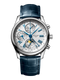 Chronograph Moonphase Date, Self-winding mechanical movement beating at 28'800 vibrations per hour, with a monocrystalline silicon balance-spring power reserve up to 66 hours. Water-resistant to 3 bar, Scratch-resistant sapphire crystal, with several layers of anti-reflective coating on both sides. Silver dial. Alligator strap bracelet, With triple safety folding clasp and push-piece opening mechanism.