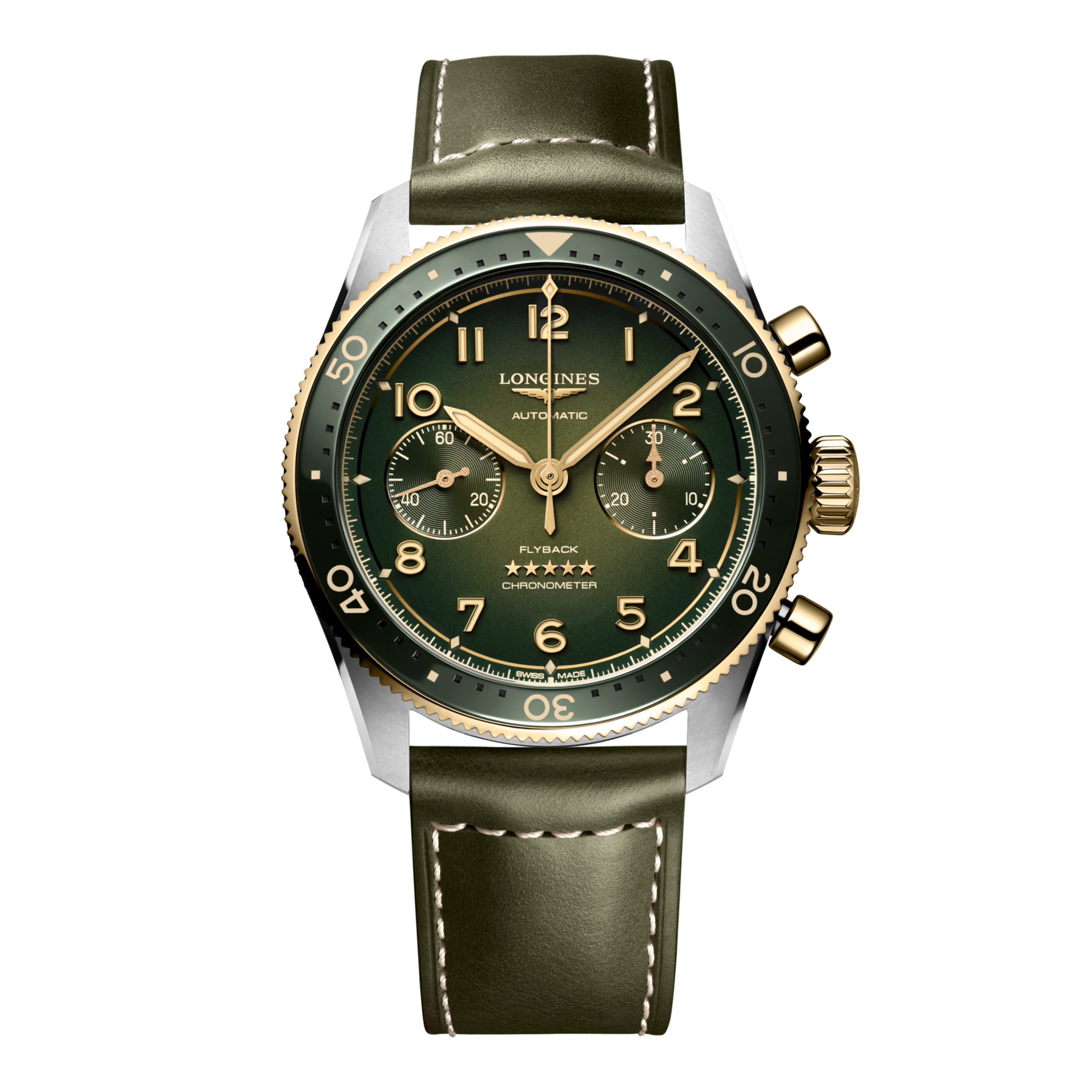 TECHNICAL DATAMODEL: L3.821.5.53.2 COLLECTION: Spirit DIAL COLOR: Green STRAP COLOR: Green STRAP MATERIAL: Leather STRAP BUCKLE: With double security folding clasp with micro adjustment system MOVEMENT: Automatic CALIBER: 791 CASE SHAPE: Round CASE SIZE: 42.00 mm CASE MATERIAL: Stainless steel and 18 karat yellow gold cap 200 BEZEL MATERIAL: Bi-directional rotating bezel, Screw-in crown WATER PROOF: 10 bar