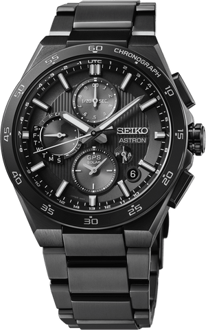 Astron GPS Solar Dual-Time Chronograph High speed GPS time and time zone adjustment (39 time zones) Perpetual day and date calendar correct to the year 2100 1/20 second chronograph with vertical subdial layout Dual time indicator and time transfer functions DST, in-flight mode, and power save functions AM/PM and signal reception result indicators Ceramic bezel insert with tachymeter Black textured dial with contrasting subdials LumiBrite hands and markers Tri-fold push button release clasp with Smart Adjuster function