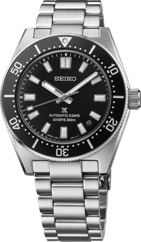 1965 Heritage Diver's Watch. Designed for those who treat life as the ultimate adventure, the Seiko Prospex collection meets every challenge with technological excellence and style. Part of a rich legacy of innovation in high-intensity timekeeping, Prospex continues to celebrate a long history of sports watch excellence with re-creations and re-interpretations of landmark achievements. Updated with more power, greater water resistance, enhanced legibility and a compact construction designed for maximum comfort, this rugged yet sleek timepiece reimagines Seiko's 1965 first diver's watch, the beginning of the company’s legacy of setting the standards in dive watch technology and design. Framed by a coordinating uni-directional rotating elapsed timing bezel, the rich black dial offers a date calendar between 4 and 5 o’clock allowing for LumiBrite coating on the hands and all 12 markers, improving symmetry and legibility. With an upgraded power reserve of approximately 72 hours, 3 full days, the 24-jewel automatic movement beats at a frequency of 21,600 vibrations per hour and includes manual winding capability. Crafted of stainless steel with super-hard coating, this superbly functional diver’s watch features a curved sapphire crystal with anti-reflective coating on the inner surface, as well as a screwdown crown and caseback. The bracelet is designed to incorporate links with a short pitch and a smaller clasp to match the sophisticated case design, which despite its slim profile, follows ISO standards for scuba diving to depths of up to 300 meters. 300m Water Resistant