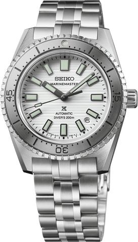 Prospex Marinemaster 1965 Heritage Diver's Limited Edition First globally available series to bear the "Marinemaster" name Limited edition of 1,000 Production serial number engraved on caseback Inspired by Seiko's first diver's watch from 1965 Seiko's slimline mechanical diver's watch Automatic with manual winding capability Silver uni-directional rotating elapsed timing bezel White patterned dial LumiBrite hands and markers See-through screwdown caseback Tri-fold push button release clasp with secure lock and extender Packaged in a special collector's box