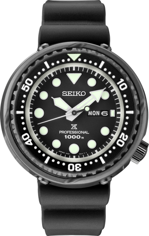 1975 Saturation Diver's Watch Reinterpretation. Designed for those who treat life as the ultimate adventure, the Seiko Prospex line meets every challenge with technological excellence and style. Part of a rich legacy of innovation in high-intensity timekeeping, Prospex continues to celebrate a long history of sports watch excellence with recreations and reinterpretations of landmark achievements. Honoring the first watch designed to withstand the dangerous world of the professional diving, Seiko's 1975 saturation diver, with its one-piece case, outer shroud and revolutionary L-shaped protective gasket, this extraordinary reinterpretation retains the solid can-like lines and functionality of the original, improved with upgraded specifications and materials. Following ISO standards for diving to depths of up to 1,000 meters, this powerful saturation diver features a one-piece inner case in light and durable titanium, as well as a ceramic outer case. The one-way rotating elapsed timing bezel is crafted of stainless steel with black super-hard coating. Arrow shaped minute hands, simple geometric indices, narrower bezel markers and LumiBrite enhancement offer sharper legibility, while the sapphire crystal provides improved scratch resistance. With secure screwdown crown, silicone strap and day/date calendar, this updated design is powered by a unique extended-life quartz battery with increased torque, engineered specifically for diver's watches. 1,000m Water Resistant.