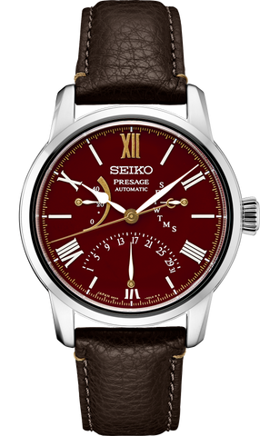 Presage Craftsmanship Series Seiko Watchmaking 110th Anniversary Urushi Lacquer Dial Limited Edition. To mark 110 years of watchmaking excellence, Seiko is highlighting its continuous dedication to evolving technology, as well as diversity, equality and the sustainable manufacturing necessary to meet environmental challenges. Part of a collection celebrating traditional Japanese crafts, this exquisite Limited Edition, available only in a controlled-production run of 1,500, with the serial number engraved on each caseback, extends the Presage tradition of blending precision technology with superior craftsmanship and design, offering the finest in Japanese mechanical watchmaking with a uniquely Japanese sense of beauty. Honoring the century-old art of Urushi lacquer, the distinctive dial is in a coppery brown hue inspired by the streetscape of Kanazawa, where the Urushi craft was nurtured through a fusion of aristocratic and samurai traditions. Created by master craftsman Isshu Tamura, the dial expresses gratitude to our culture, featuring a new design with alternating Roman numerals and indices, as well as both day and date retrograde subdials, and a power reserve indicator. Visible through the screwdown, see-through caseback, the 31-jewel automatic movement beats at a frequency of 28,800 vibrations per hour, with a power reserve of approximately 45 hours and manual winding capability. In stainless steel, with super-hard coating and a new refined and beautifully proportioned case shape, this exceptional design includes a dual-curved anti-reflective sapphire crystal. tri-fold push button release clasp, and a dark brown sustainable leather strap, certified by the Leather Working Group (LWG). Packaged in a Limited Edition collectors’ box. 10 bar, 100M Water Resistant