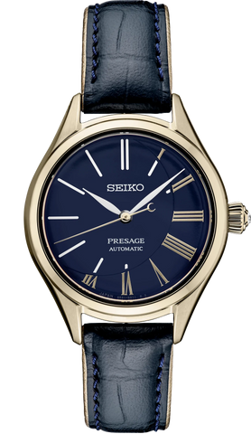 Presage Enamel Limited Edition. Offering the finest in Japanese mechanical watchmaking, the Presage Collection blends precision technology with superior craftsmanship and design. Part of a collection dedicated to the theme of Eternal Beauty, this elegant Limited Edition, available only in a controlled-production run of 1,000, with the serial number engraved on each caseback, was inspired by a crescent moon against the winter sky. The enduring theme of the moon and it's importance in Japanese culture is reflected in the rich blue dial with its distinctive asymmetrical crescent layout and the blue crocodile strap with gold backing. To highlight the beauty of hand-craftsmanship by master enamel artists, the dial is uninterrupted by subdials or inserts. The slim 24-jewel automatic movement beats at a frequency of 21,600 vibrations per hour with a power reserve of approximately 70 hours and manual winding capability. Crafted of stainless steel with regal gold finish, this graceful timepiece includes a diamond cabochon crown, dual-curved anti-reflective sapphire crystal, and tri-fold push-button release clasp. 5 bar, 50M Water Resistant.