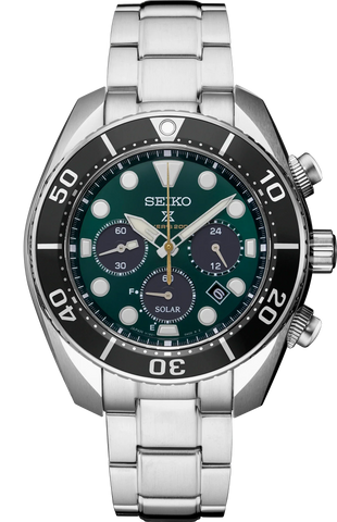 140th Anniversary Limited Edition Solar Chronograph Diver. Designed for those who treat life as the ultimate adventure, the Seiko Prospex line meets every challenge with technological excellence and style. To mark the 140th anniversary of the founding of Seiko, Prospex is celebrating its rich legacy of innovation in high-intensity timekeeping and the company's role as the preferred watch for explorers under the sea, on land and in the air. Complete with a special Limited Edition caseback, this solar chronograph also pays tribute to one of the world's leading diving destinations, Irimote Island, one of the Yaeyama Islands, off Okinawa, nicknamed "the Galapagos of East Asia," with a rich "Island Green" theme reflecting the verdant primeval forests of Irimote. Echoing the design of Seiko's acclaimed 2007 diver's watch, with its distinctive wide case and thick printed numerals on the black unidirectional rotating elapsed timing bezel, this unique watch features a green dial with red subdials, date calendar, power reserve and 24-hour indicators, and LumiBrite hands and markers. The chronograph measures up to 60 minutes of elapsed time in 1/5-second increments with split-time measurement function. Powered by any light source, with no battery change required, the energy-efficient solar cell provides a 6-month power reserve when fully charged. In stainless steel with super-hard coating, this exceptional timepiece includes a sapphire crystal, screwdown crown and caseback, and tri-fold push-button release clasp with secure lock and extender, and follows ISO standards for scuba diving to depths of up to 200 meters. Includes an additional green silicone strap. 200m Water Resistant