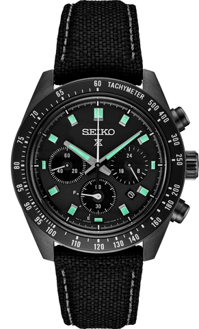 Seiko Speedtimer Solar Chronograph. Designed for those who treat life as the ultimate adventure, Seiko Prospex keeps moving forward, meeting every challenge with technological excellence and winning design. This dramatic watch is part of a high-intensity collection inspired by the 1969 "Speedtimer," the world's first self-winding chronograph, extending it to the Black Series. Featuring Seiko's "Green LumiBrite Pro," developed by combining the color most recognizable in the dark with a higher brightness and longer afterglow, this extraordinary timepiece provides a "night vision" experience for visibility in the dark resembling the view seen through a night scope. The chronograph function measures up to 60 minutes of elapsed time in 1/5-second increments and includes a split time function, while the solar cell, powered by any light source, with no battery change required, provides a 6-month power reserve when fully charged. The dark gray dial features 3 black subdials, and includes a 24-hour indicator and power reserve indicator, as well as a date calendar and green LumiBrite hands and markers. Crafted of stainless steel with black hard coating paired with a black combination nylon/ leather strap, it also includes a curved anti-reflective sapphire crystal, black tachymeter bezel, and a secure screwdown caseback. 10 bar, 100M Water Resistant