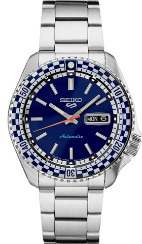 Seiko 5 Sports Special Edition. For decades, Seiko 5 Sports has delivered consistently high levels of reliability, durability, and performance. This dynamic watch offers current styling with a vintage feel, featuring an updated case and streamlined dial, while retaining the retro silver and blue color scheme. Inspired by the vintage Seiko 5 Sports models of the 1960s and 1970s, this timepiece is framed by a blue and white checkered uni-directional rotating bezel, while the blue dial with sunray finish includes a day/date calendar, red-orange second hand, and luminous hands and markers. The design takes its color scheme and bezel pattern from the "Checker Flag," one of the most popular designs of the era. Providing automatic technology that you control with every movement, the 24-jewel movement, visible through the screwdown see-through caseback, beats at a frequency of 21,600 vibrations per hour, with a power reserve of approximately 41 hours and manual winding capability. In stainless steel with locking tri-fold push button release clasp. 10 bar, 100M Water Resistant